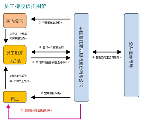 什么是“员工持股信托”? 员工持股信托是员工一种新的投资方案。通过每隔一段时间以确定的金额投资公司股票,及提供在信托期限内运用指示的权利和各种资产返还的方式,让员工可享受股东稳定的收入并维持他们的自主权。以提高员工的退休福利。 如何开办“员工持股信托”? 公司的员工将成立一个股东联合会并且与受托人签订一个信托合同。此合同规定了员工必须分配的信托资金,且信托资金由受托人用来管理公司股票和计算信托财产权益。在员工个人和受托人之间的信托目的完成或信托期限终止后,受托人将累积的股票或现金返还给员工。
