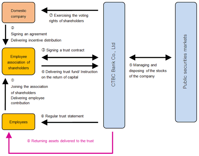 What is “employee stock ownership trust”? Employee stock ownership trust is a new investment solution for employees. By investing in the stock of the employee at regular intervals and with determined dollar amount, and offering the right to use the asset within the duration of the trust and various means of returning the assets, employees can enjoy the steady revenue from being shareholders and maintain their autonomy. The company can improve employee welfare and help plan for employees’ retirement.How can a company start an “employee stock ownership trust”? The company’s employees will form an association of shareholders and sign a trust contract with the trustee. The contract specifies the trust capital that the employees must distribute, and the trust capital is used by the trustee to manage the stocks of that company and calculate the trust property equity. After the purpose of the trust is completed or the trust duration is terminated between individual employee and trustee, the trustee will return the stocks accumulated, or cash, to the employees.Employee stock ownership trust diagram