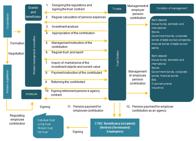 What is “employee benefit savings trust”? ”Employee benefit savings trust” is a trust in which grantors turn over the employer and employee’s contribution to the trust managed by CTBC. This trust is a combination of savings and investment that designs “employee benefit plans,” helping companies improve performance and employer-employee relationship with “employee benefit plans.”How an “employee benefit savings trust” can be started? The company or its employees will for a benefit savings committee, sign a trust contract with the trustee that specifies the trust funds that should be contributed to the trustee and should be accounted for trust property equity. After the purpose of the trust is completed or the trust duration terminated between individual employee and trustee, the trustee returns the trust asset value to employees.Structure of the product