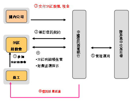 經由公司內部員工所組成之分紅持股會與本行簽訂信託契約,約定將分紅股票及企業獎勵金共同交付受託銀行,依據保障退休生活及員工個人財產形成之目的運用管理分紅股票;經由本行差異化服務,活絡信託資產創造額外增值。待信託期間屆滿或終止時,分年或依次返還股票或現金給員工。